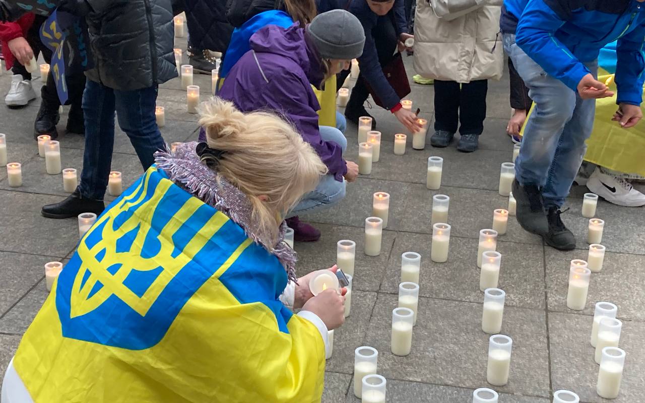 (PR) Hunderte Menschen haben am Freitagabend 1.500 Grablichter auf dem Roncalliplatz aufgestellt. Im Schatten des Doms sollte jede Kerze an einen in der Ukraine getöteten Menschen erinnern. Dazu aufgerufen hatte der Verein Blau Gelbes Kreuz.