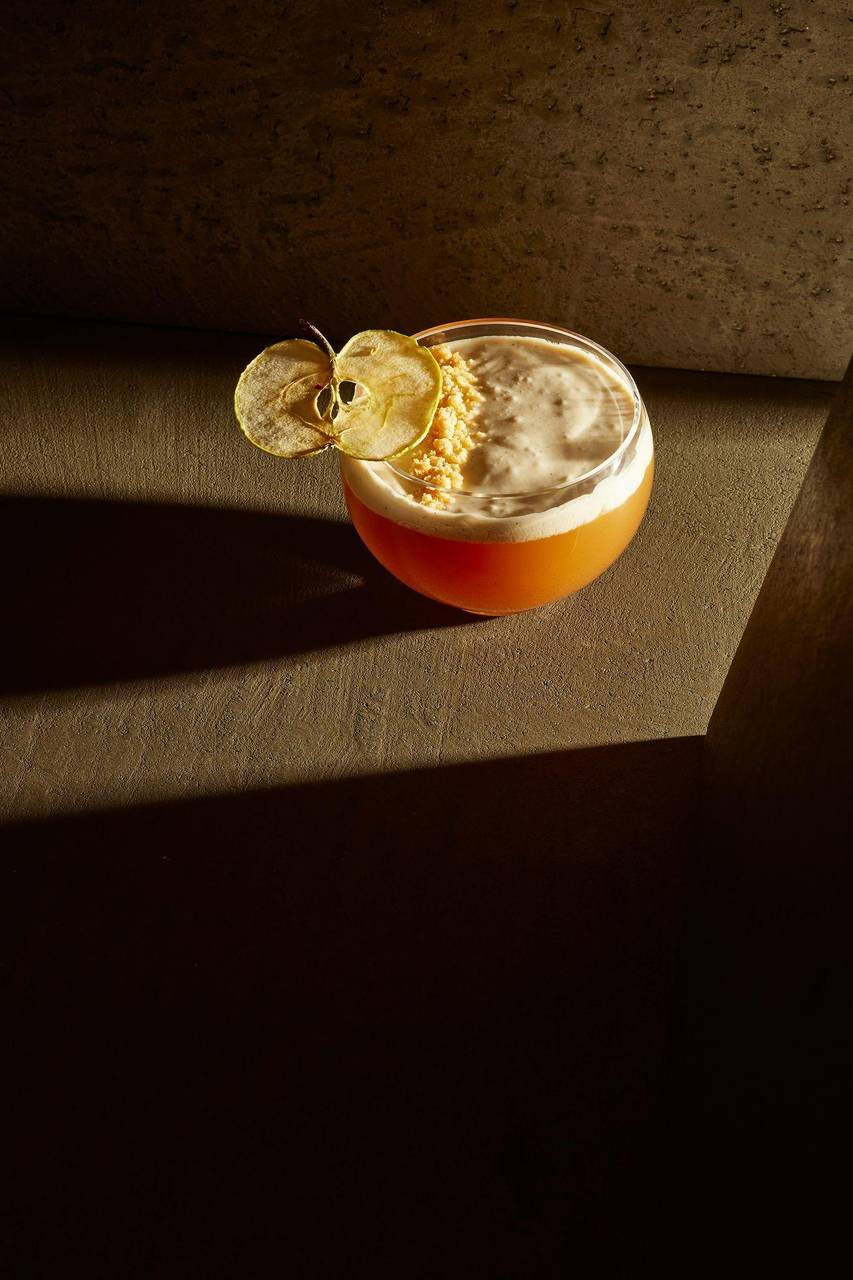 Kalt: Ein paar Eiswürfel in das Glas geben, 180 ml des kalten Apfel-Gewürz-Suds darübergießen. Etwas Vanille-Schaum über den Rücken eines Barlöffels auf das Getränk gießen und mit einem Apfelchip und Keks-Crumble garnieren.