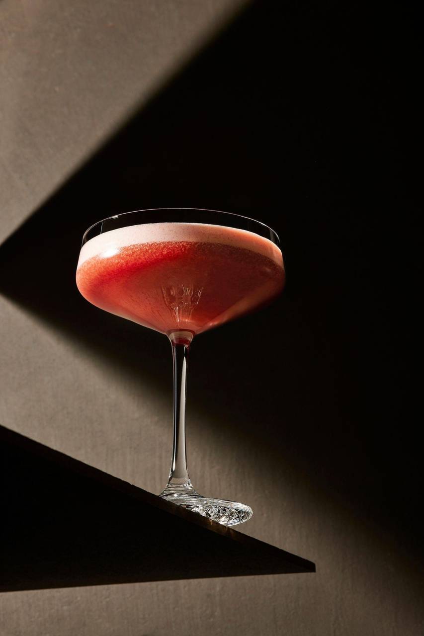 Anrichten des Drinks in einer Cocktail-Schale oder einem bauchigen Weinglas ohne Eis.