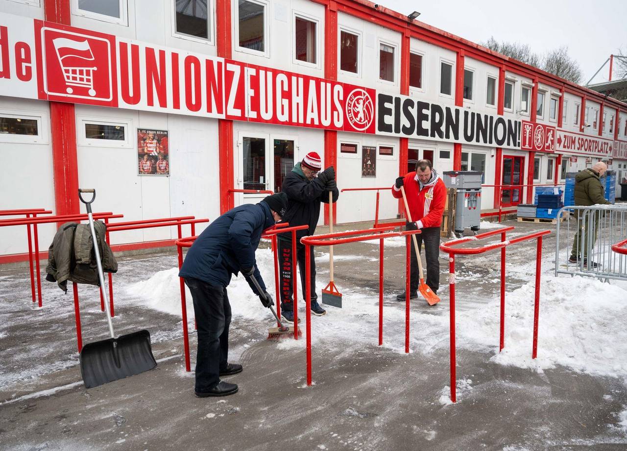 Freiwillige Fans des 1. FC Union befreien Wege und Parkplätze am und im Stadion An der Alten Försterei von Schnee.