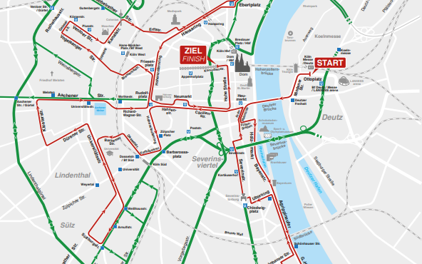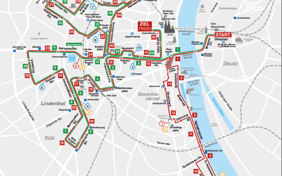 Der Marathon sowie der Staffel- und Schulmarathon starten um 10:30 Uhr in Deutz. Für den Schulmarathon geht es ein wenig später los. Die Laufstrecke führt über Rodenkirchen, Sülz, Lindenthal, Ehrenfeld und Nippes bis zum Kölner Dom.