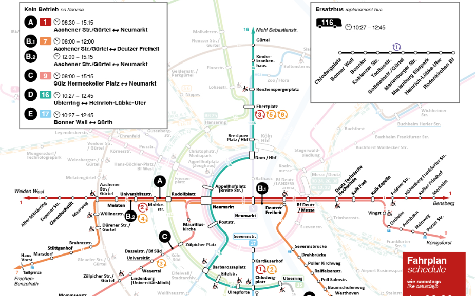 Die KVB fährt zwischen 8 Uhr und 20 Uhr nach Samstagsfahrplan. Zwischen 7 Uhr und 18:45 Uhr gibt es Einschränkungen bei den KVB-Linien 1, 7, 9, 16 und 17. Zwischen den Haltestellen Rodenkirchen Bahnhof und Chlodwigplatz wird ein Ersatzbus eingesetzt.
