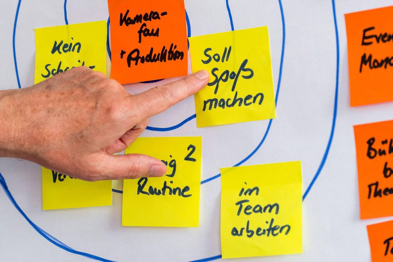 Eine Person klebt Post-its auf ein Flipchart