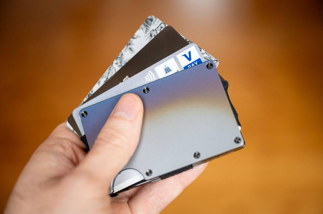 Ein Mann hält einen Cardholder mit verschiedenen Bezahlkarten