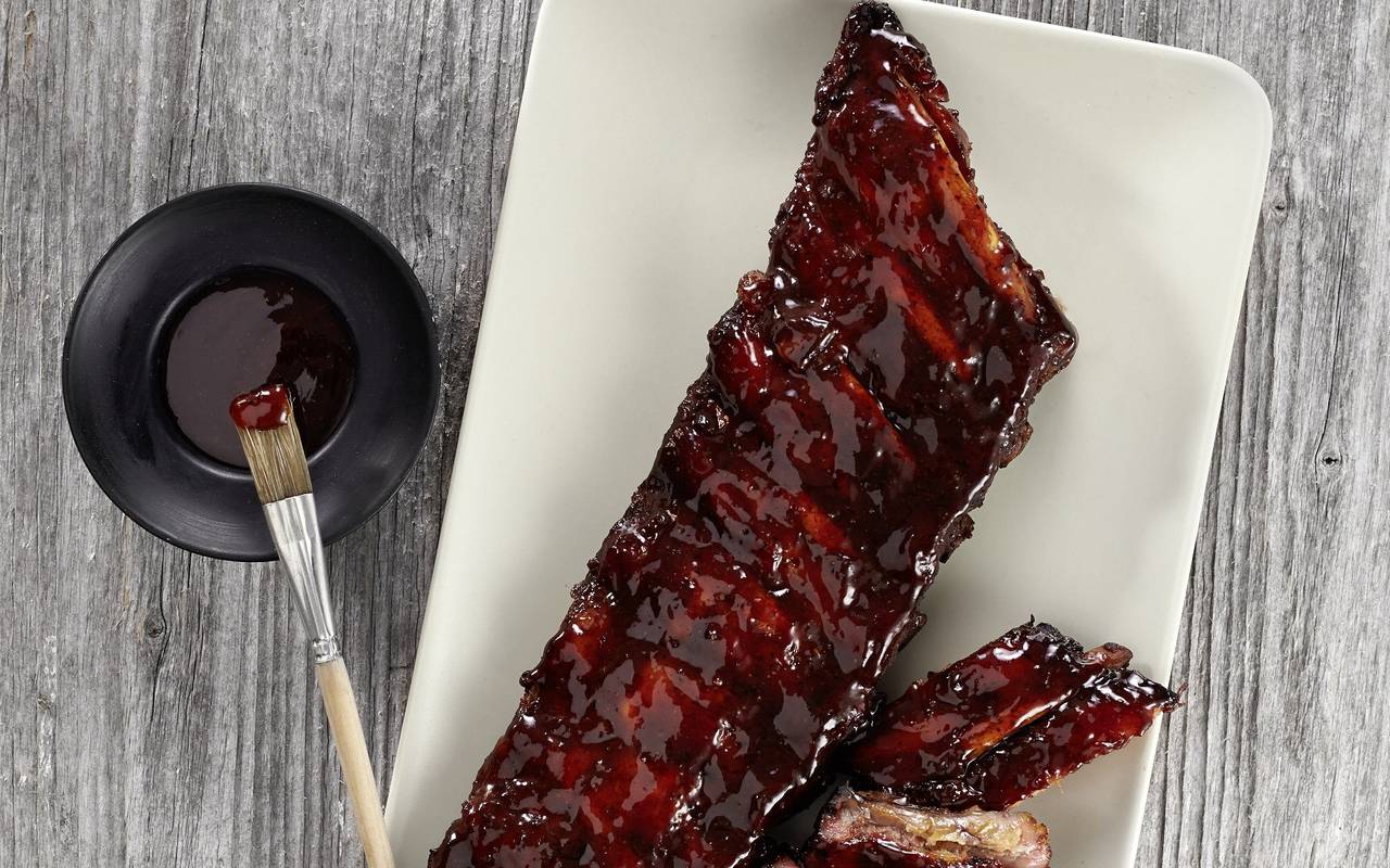 Die Silberhaut von der Knochenseite der Ribs entfernen und das Fett trimmen. Hierzu mit einem kleinen Messer unter die Silberhaut schneiden und die Haut mit einem Küchenkrepp abziehen. Jeden Knochen auf der Unterseite leicht einschneiden. Die Zutaten für den Dry Rub gut vermischen. Die Spare Ribs mit dem Dry Rub bestreuen und in Frischhaltefolie einwickeln. Über Nacht kühlen. Die Zutaten für das Finishing Glaze in einen kleinen Kochtopf geben. Gut umrühren und kurz aufkochen. Danach weitere 20 Minuten simmern lassen. Die benötigte Menge ist etwas weniger – das Glaze ist aber auch eine leckere BBQ Sauce und hält im Kühlschrank einige Tage.