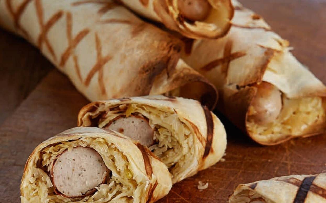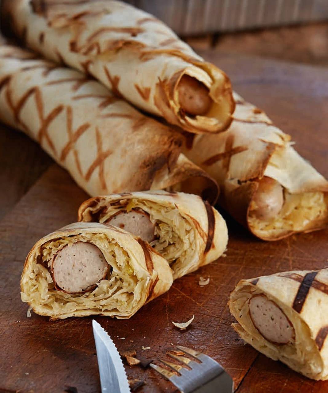 9) die Rostbratwurst im unteren Drittel auflegen und stramm aufrollen und mit Holzspießen fixieren