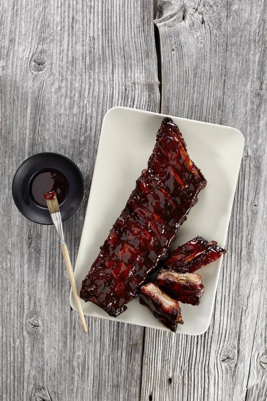 Die Spare Ribs werden insgesamt 4 Stunden indirekt gegrillt. Dafür eignet sich am besten ein Barbecue Smoker oder ein Kugelgrill. Die Spare Ribs gelingen aber auch in jedem anderen Grill der einen Deckel hat und sich für indirektes Grillen eignet (z.B. Gasgrill mit Deckel). Die Temperatur muss immer zwischen 110 und 130 Grad liegen. Die Spare Ribs mit der Fleischseite nach unten in den Grill geben. Am Anfang mit etwas mehr Rauch arbeiten oder Holzchips verwenden. Nach 45 Minuten die Spare Ribs wenden und weitere 45 Minuten im Grill lassen. Die Spare Ribs vom Grill nehmen und die Reihen in eine Edelstahlschale oder Auflaufform geben. Den Apfelsaft mit in die Schale geben und mit Alufolie dicht verschließen. Die Alufolie sollte keinen Kontakt zu den Spare Ribs haben. Die Spare Ribs in der Schale weitere 1,5 Stunden indirekt grillen und die Temperatur auf 130 Grad erhöhen. Die Spare Ribs aus der Schale nehmen und dünn mit dem warmen Finishing Glaze bepinseln. Weitere 60 Minuten indirekt grillen und darauf achten, dass sie nicht zu dunkel werden. Ab und zu mit dem Finishing Glaze bepinseln. Die Spare Ribs im sogenannten „Cadillac Cut“ servieren – ein Knochen mit jeweils Fleisch links und rechts davon.