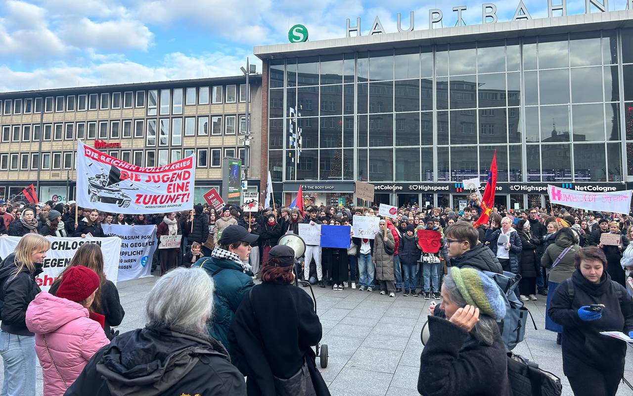 Der Bundestag hat heute auch das neue Wehrdienstgesetz beschlossen. Mehrere hundert Schülerinnen und Schüler haben dagegen auch bei uns in Köln protestiert: