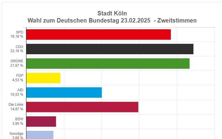 Die Linke in Köln stellt künftig mit Lea Reisner eine Bundestagabgeordnete. Die AFD bestätigt mit Jochen Haug und Fabian Jacobi zwei Bundestagsmandate. Grüne und SPD verlieren bei den Zweitstimmen auch in Köln drastisch. Sanae Abdi, Karl Lauterbach und Rolz Mützenich ziehen für die SPD ins Parlament. Für die Grünen Sven Lehmann, Katharina Dröge und Nyke Slawik. Die Kölner CDU wird mit Serap Güler trotz des Wahlsieges nur eine Abgeordnete in den 21. Deutschen Bundestag schicken. Alle weiteren Infos und Ergebnisse in unserem Liveticker. (RO|KU|DD|Symbolbild)