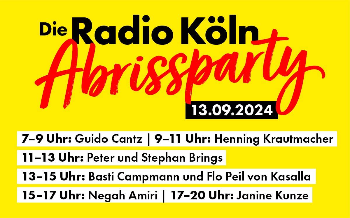 Den ganzen Tag, von 7 bis 20 Uhr, sind folgende Kölner Promis bei Radio Köln live am Mikrofon: Guido Cantz, Henning Krautmacher, Peter und Stephan Brings, Basti Campmann und Flo Peil von Kasalla, Negah Amiri, Janine Kunze. Sie alle werden sich die Klinke in die Hand drücken, Geschichten erzählen, Musik spielen, durchgeben, wie das Wetter in Köln wird und wo die Staus und Blitzer auf den Straßen sind – eben alles, was zu einer Radio Köln-Sendung dazugehört!