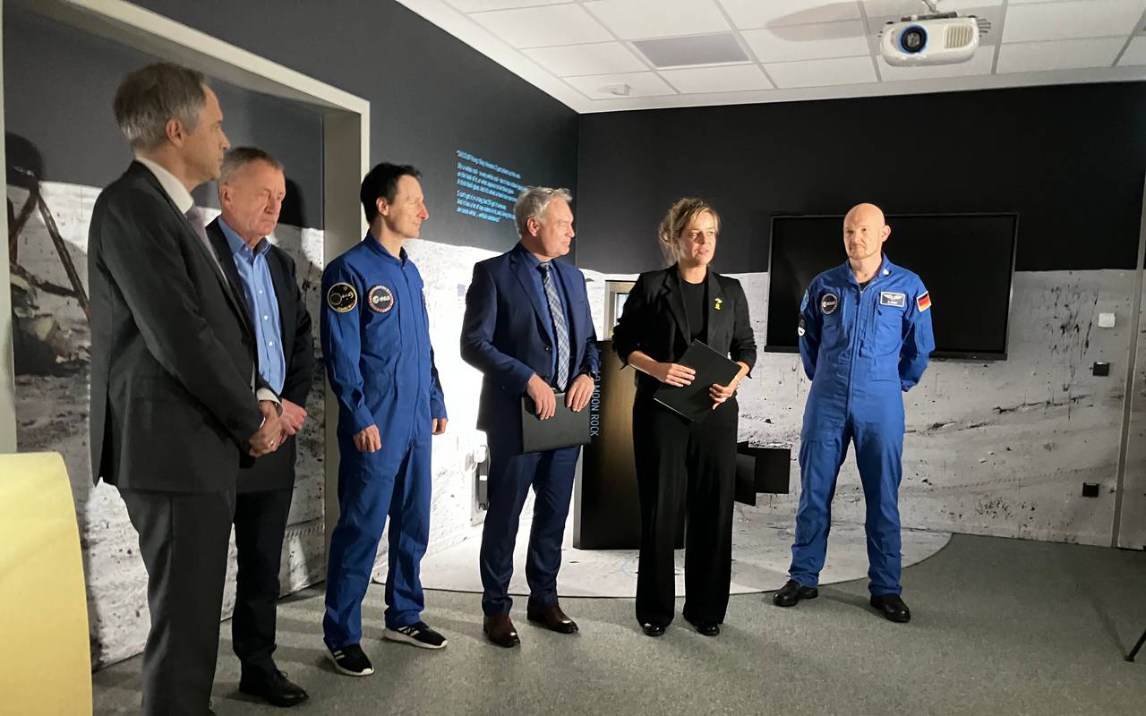 Gute Laune am Mittag in der Mondforschungsanlage bei der ESA in Porz. Der Grund für die gute Laune von NRW Wirtschaftsministerin Neubauer und den beiden deutschen Astronauten Alexander Gerst und Matthias Maurer: Der ESA-Standort Köln wird ausgebaut. Ein entsprechendes Absichtspapier wurde unterzeichnet.