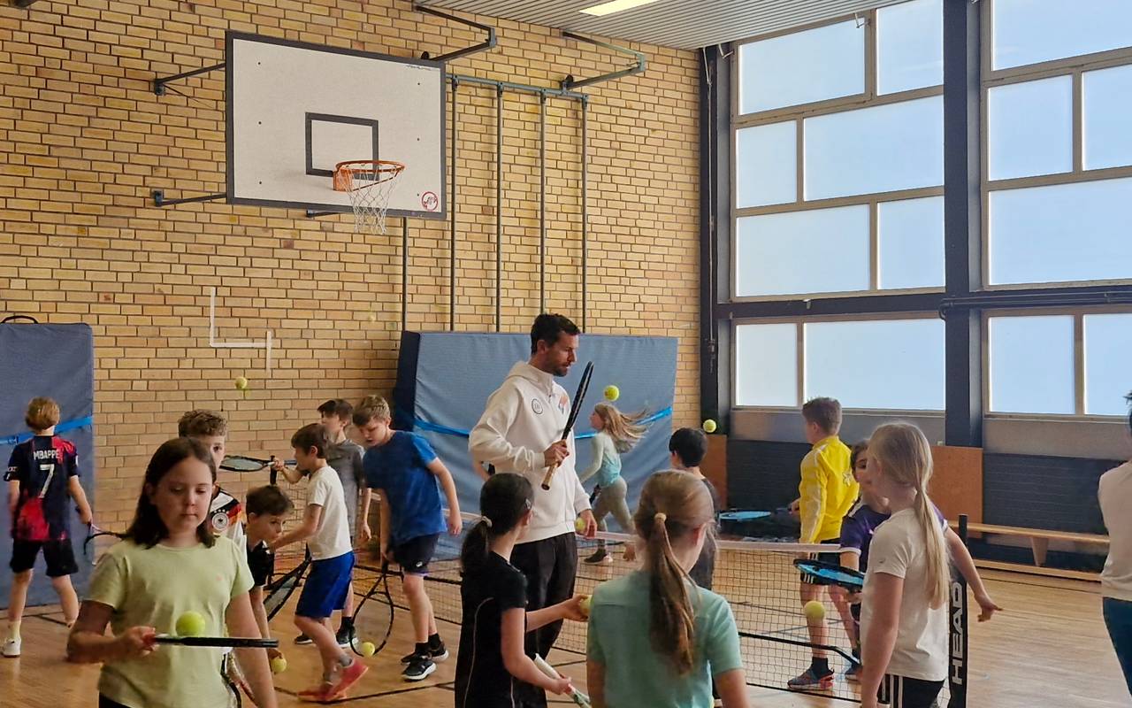 Der ehemalige Tennis-Profi Philipp Petzschner gibt an verschiedenen Schulen jeweils vier Wochen Tennistraining. Los ging es heute an der Städtischen Gemeinschaftsgrundschule Bachemer Straße.