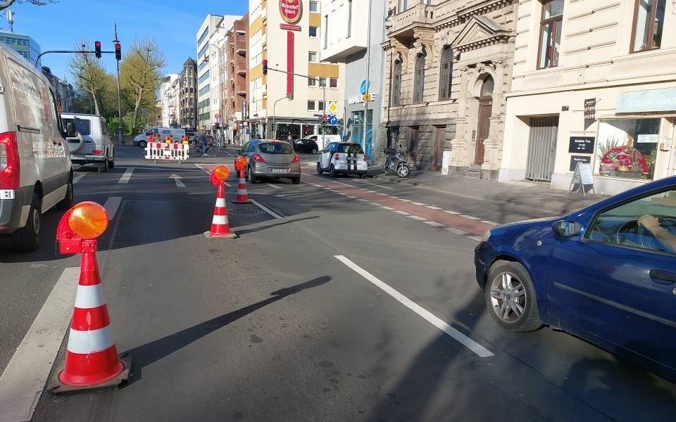 Die Kanalisation unter der Straße ist kaputt. Die Stadt füllt die kaputte Stelle jetzt auf und erneuert den Asphalt. Um nicht die gesamte Kreuzung Hansaring/Am Kümpchenshof zu sperren, laufen die Arbeiten in zwei Abschnitten. Sie sollen nächste Woche Dienstag fertig sein, sagt der Stadtsprecher weiter. So lange bleibt in Richtung Mediapark und Friesenplatz jeweils eine Spur gesperrt. (DD)