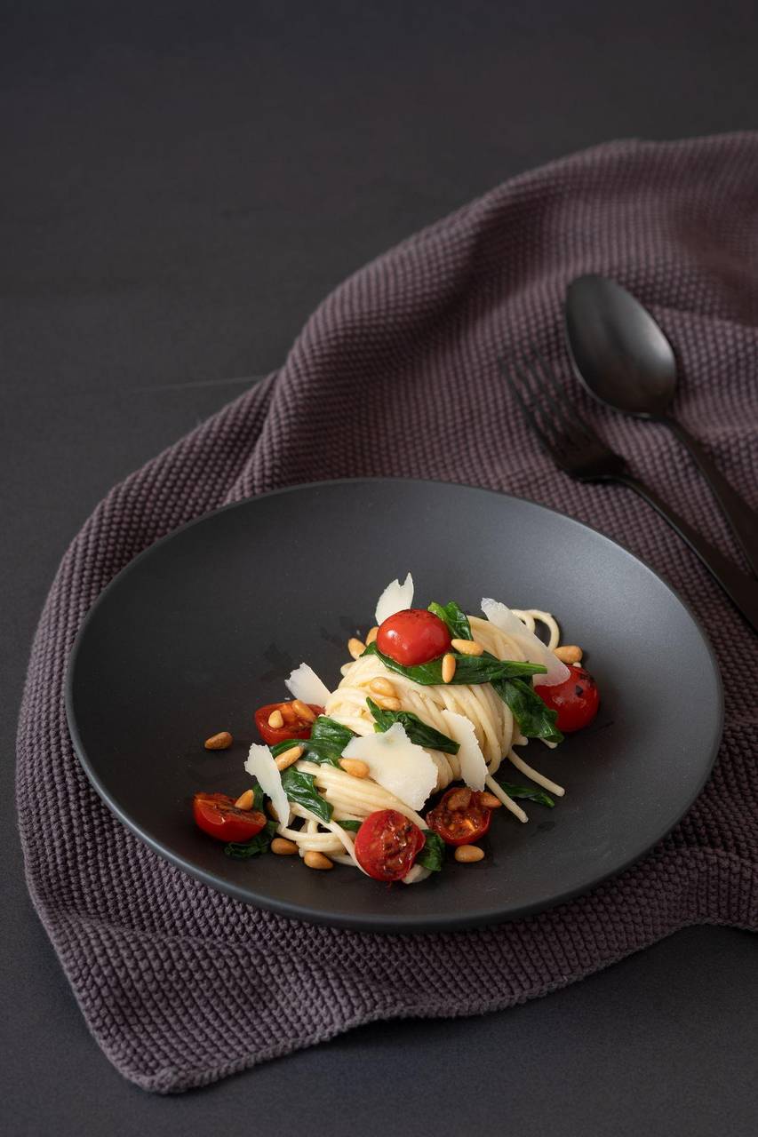 - Hoch hinaus: Was immer wirkt, ist in die Höhe anrichten, Zutaten stapeln oder aneinander lehnen. Der Rand sollte frei bleiben und der Teller nur zu zwei Dritteln gefüllt. Im Zweifel lieber einen Nachschlag servieren. Das gilt auch für Salat: Den sollte man nicht vermengen, sondern türmchenförmig anrichten und das Dressing separat reichen. Auch ein Pastateller sieht schöner aus, wenn man Spaghetti mit einer Zange in einer Suppenkeller aufdreht und die Zutaten darauf anrichtet, statt sie zu vermengen.