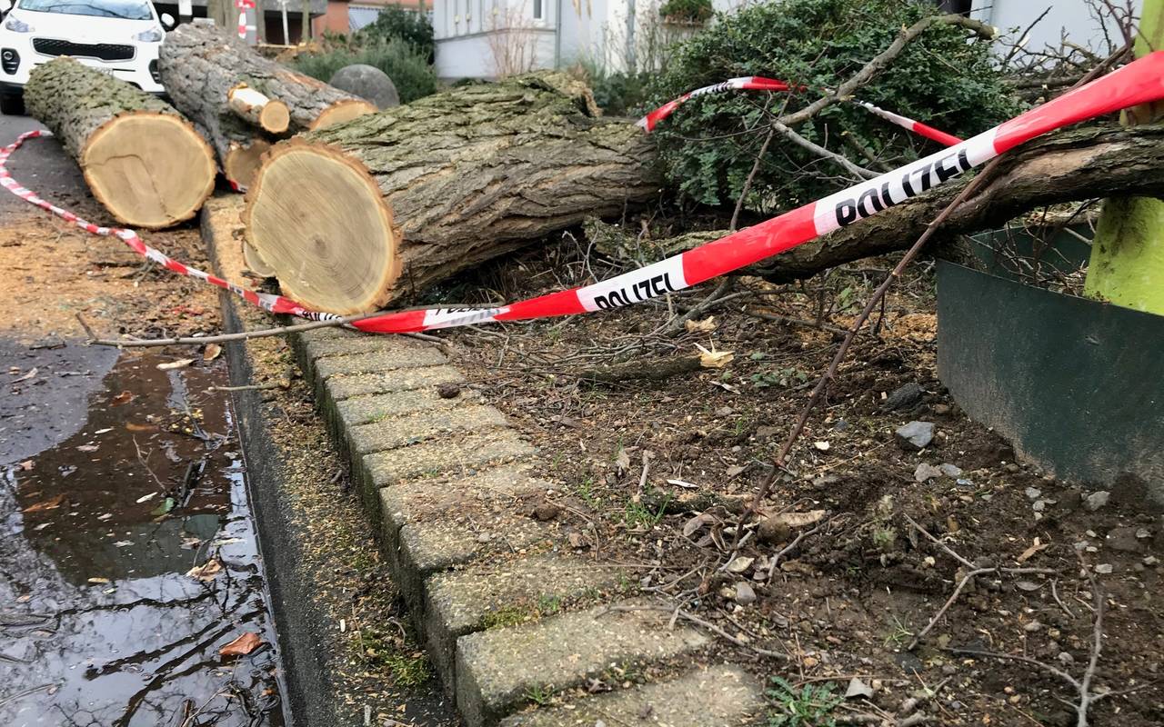 Wie die Feuerwehr mitteilt, sei am Samstagnachmittag nicht auszuschließen gewesen, dass der Baum durch den anhaltenden Sturm auf die Garage stürzt. Die Einsatzkräfte haben den Baum mit einem Kran gesichert und dann mit einer Kettensäge über die Drehleiter zerteilt.
