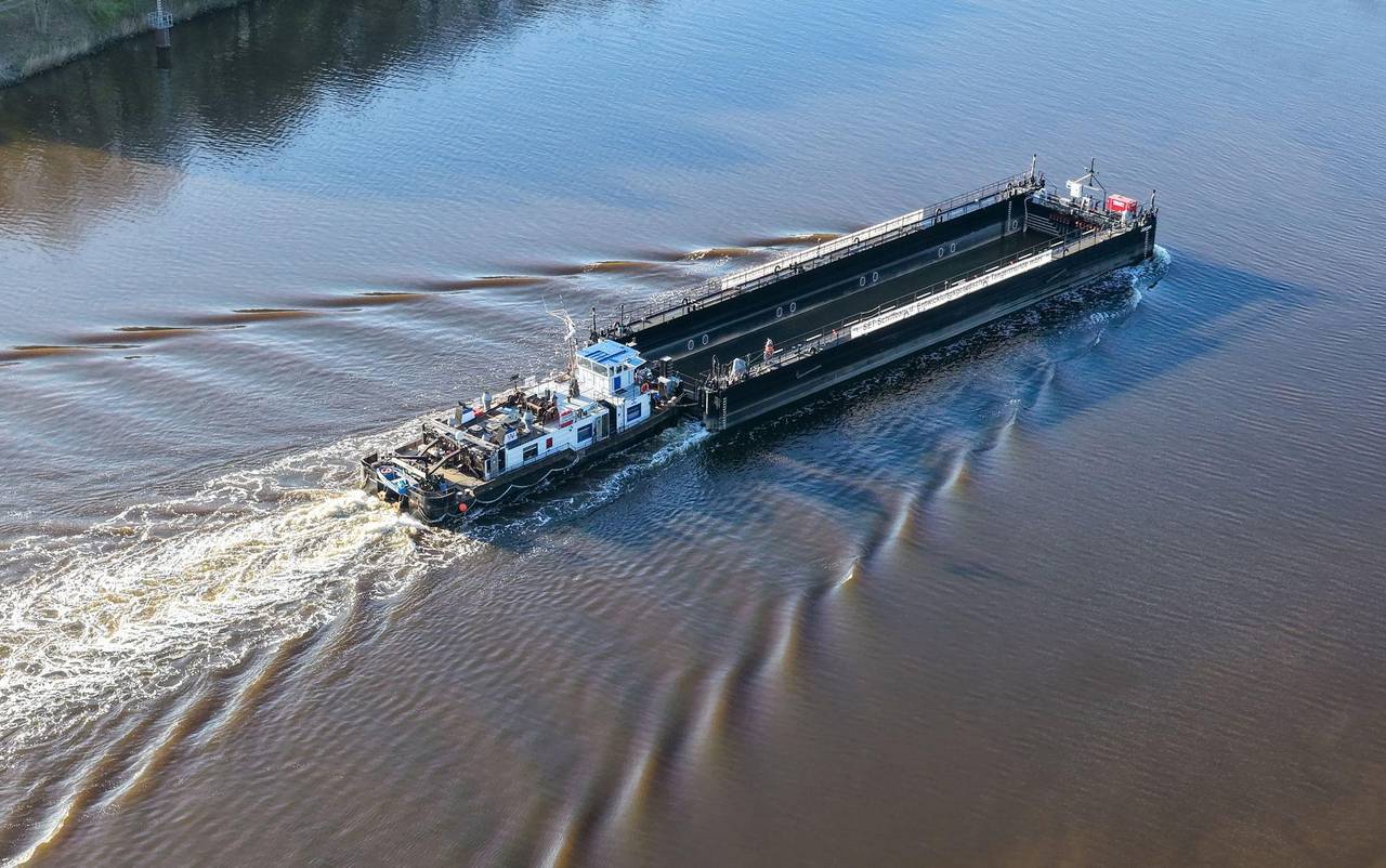 Der für den Transport des Buckelwals vor Poel gedachte Lastkahn passiert den Nord-Ostsee-Kanal.© Bodo Marks/dpa