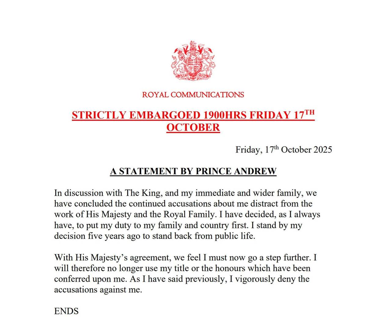 Die Erklärung zum Ende von Andrew als Herzog von York.