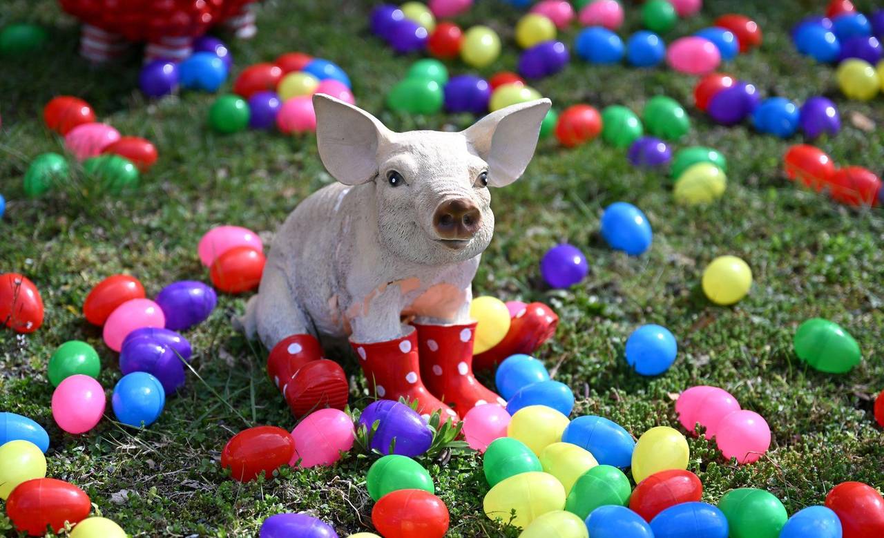 Auch zahlreiche Tiere wie etwa dieses Schwein oder auch eine Giraffe und zahlreiche Affen stehen zwischen den bunten Eiern.