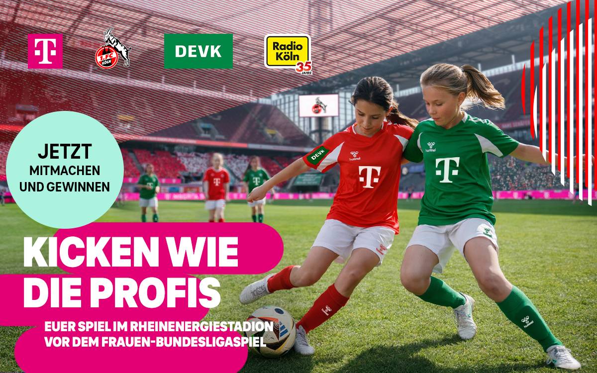 Ihr seid eine Mädchen-Fußballmannschaft und träumt davon, einmal wie die Profis im RheinEnergieSTADION aufzulaufen? Dann haben wir die Chance eures Lebens für euch: Zusammen mit der Telekom, der DEVK und dem 1. FC Köln suchen wir zwei Mädchenmannschaften, die einen unvergesslichen Profi-Spieltag erleben dürfen!