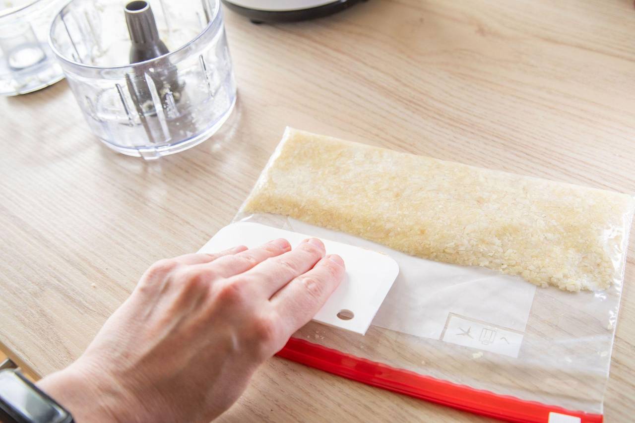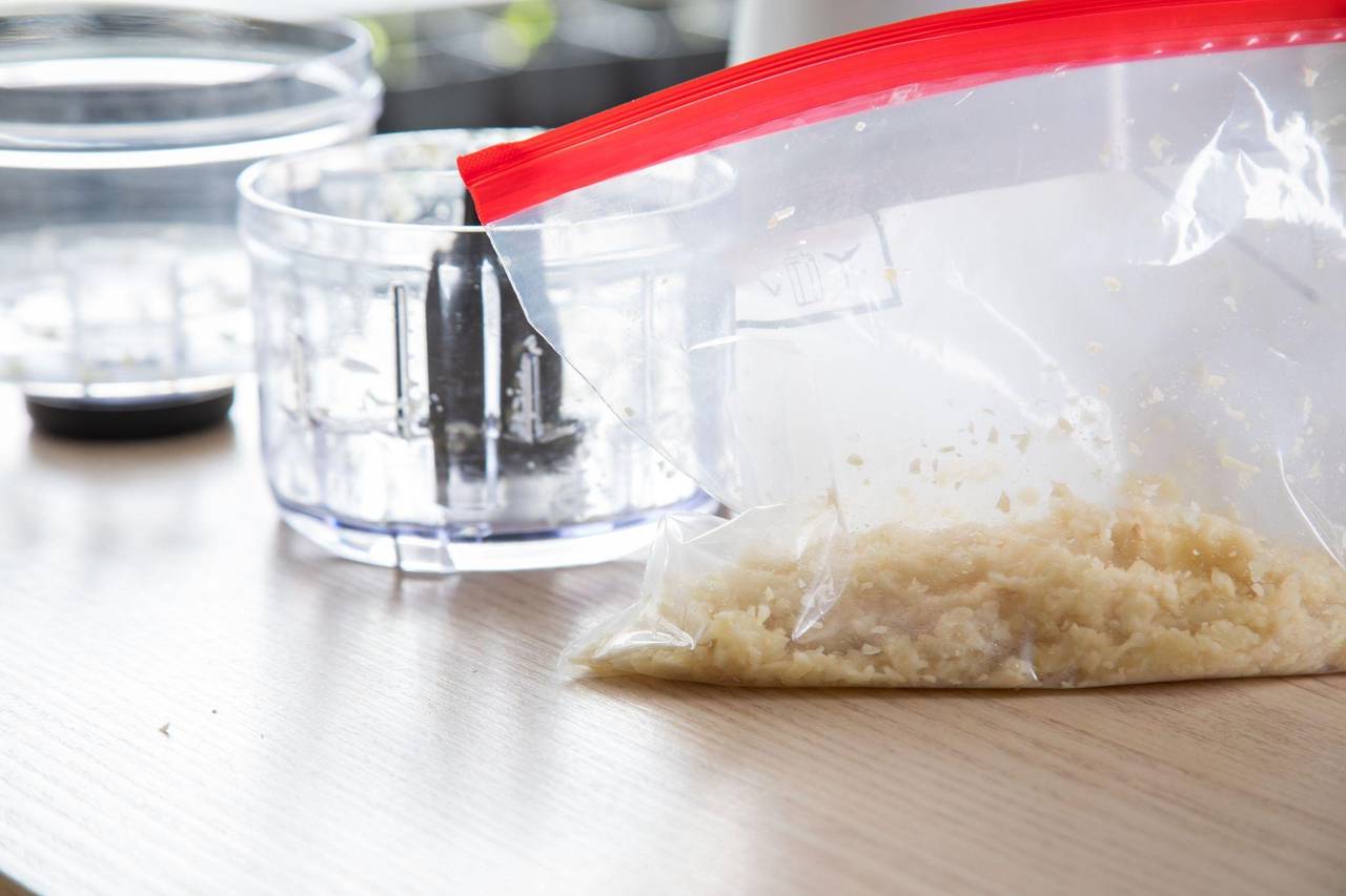 So geht's: Den Knoblauch schälen, zerkleinern und in einen Gefrierbeutel füllen. Die Knoblauchmasse mit einem glatten Hilfsmittel gleichmäßig im Beutel verteilen - zum Beispiel mit einem Teigroller oder einer Teigkarte.