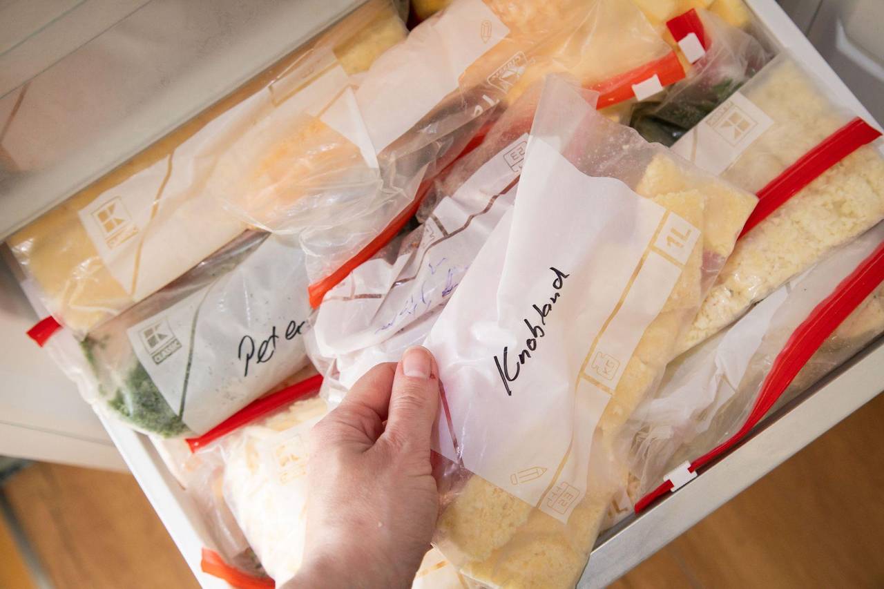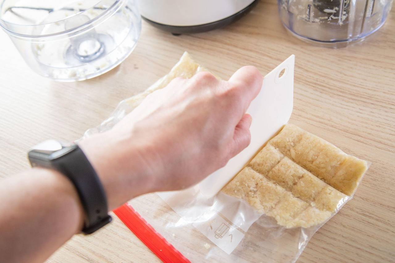 Danach mit einem Hilfsmittel - etwa der Teigkarte oder der stumpfen Seite eines Messers - ein Rastermuster in die Masse stechen, um den Knoblauch zu portionieren. Der Beutel wandert danach in den Tiefkühler. Einmal durchgefroren, lässt sich der Knoblauch in die vorportionierten Würfel brechen.