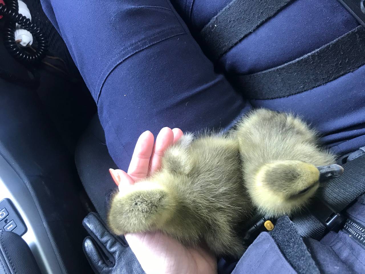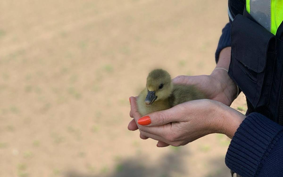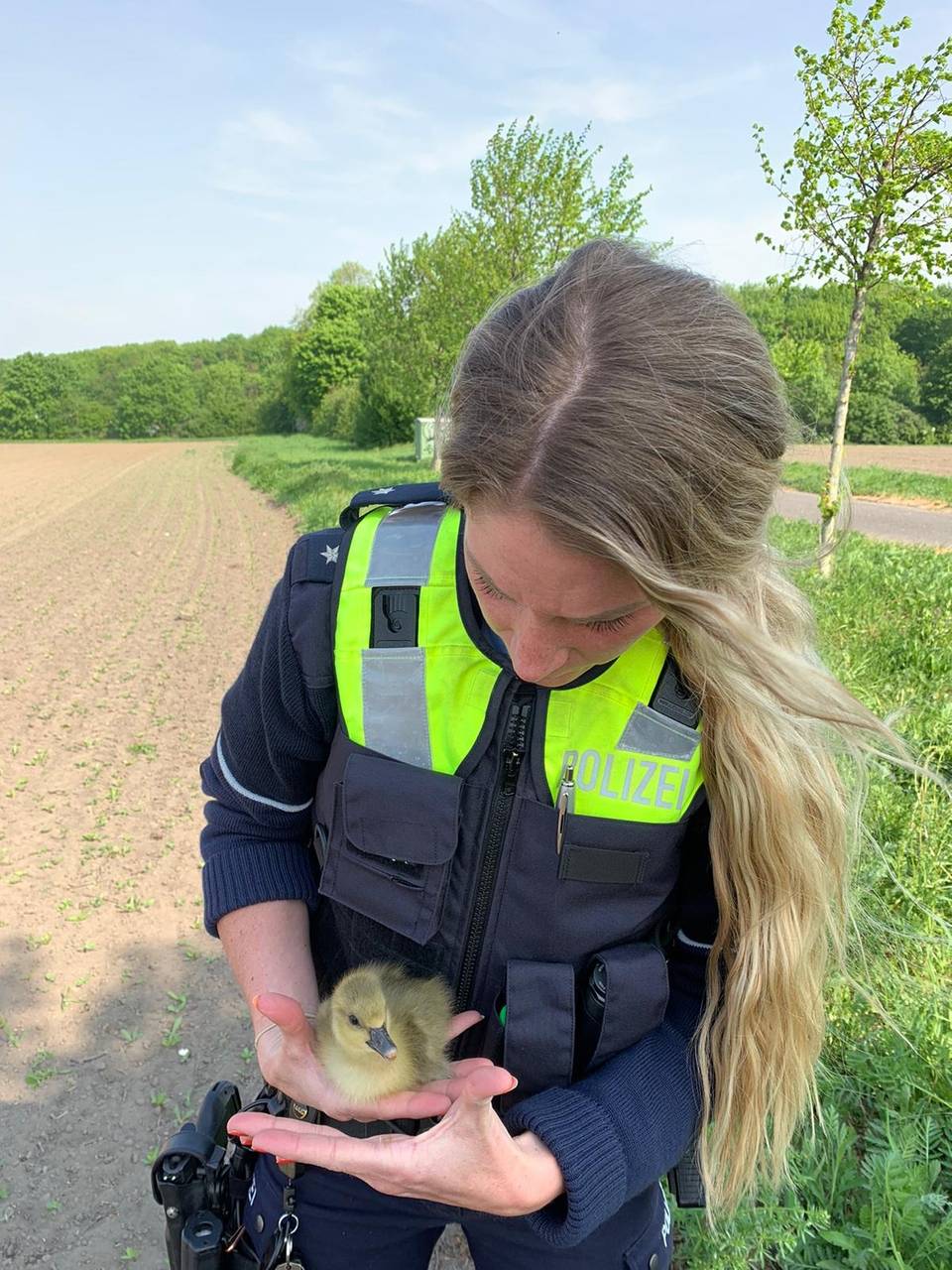 Die Gänseeltern seien davongeflogen, die Polizisten hätten behutsam die Gänsebabys geschnappt. Kurz darauf habe man auf einem Acker die Familie wieder zusammenführen können.
