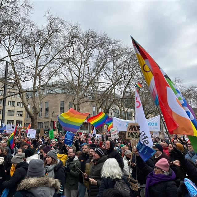 15.03 Uhr: Beide Züge sind jetzt am Hohenzollernring. Insgesamt sind es etwa 10.000 Teilnehmer - also deutlich weniger als anfangs gedacht. Alle bisherigen Sperrungen werden laut Polizei jetzt Stück für Stück wieder aufgehoben.