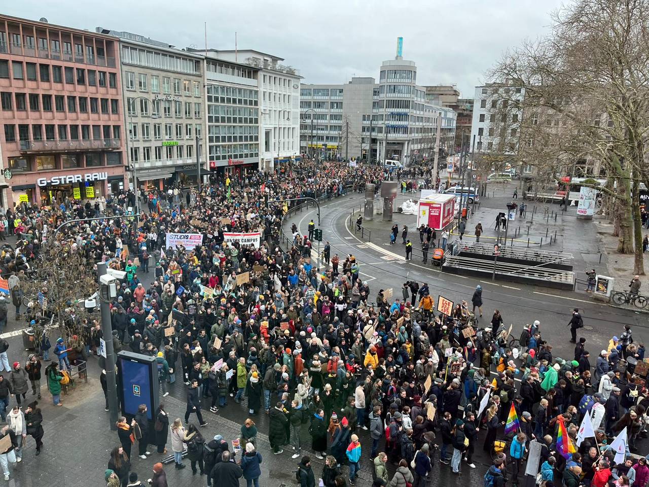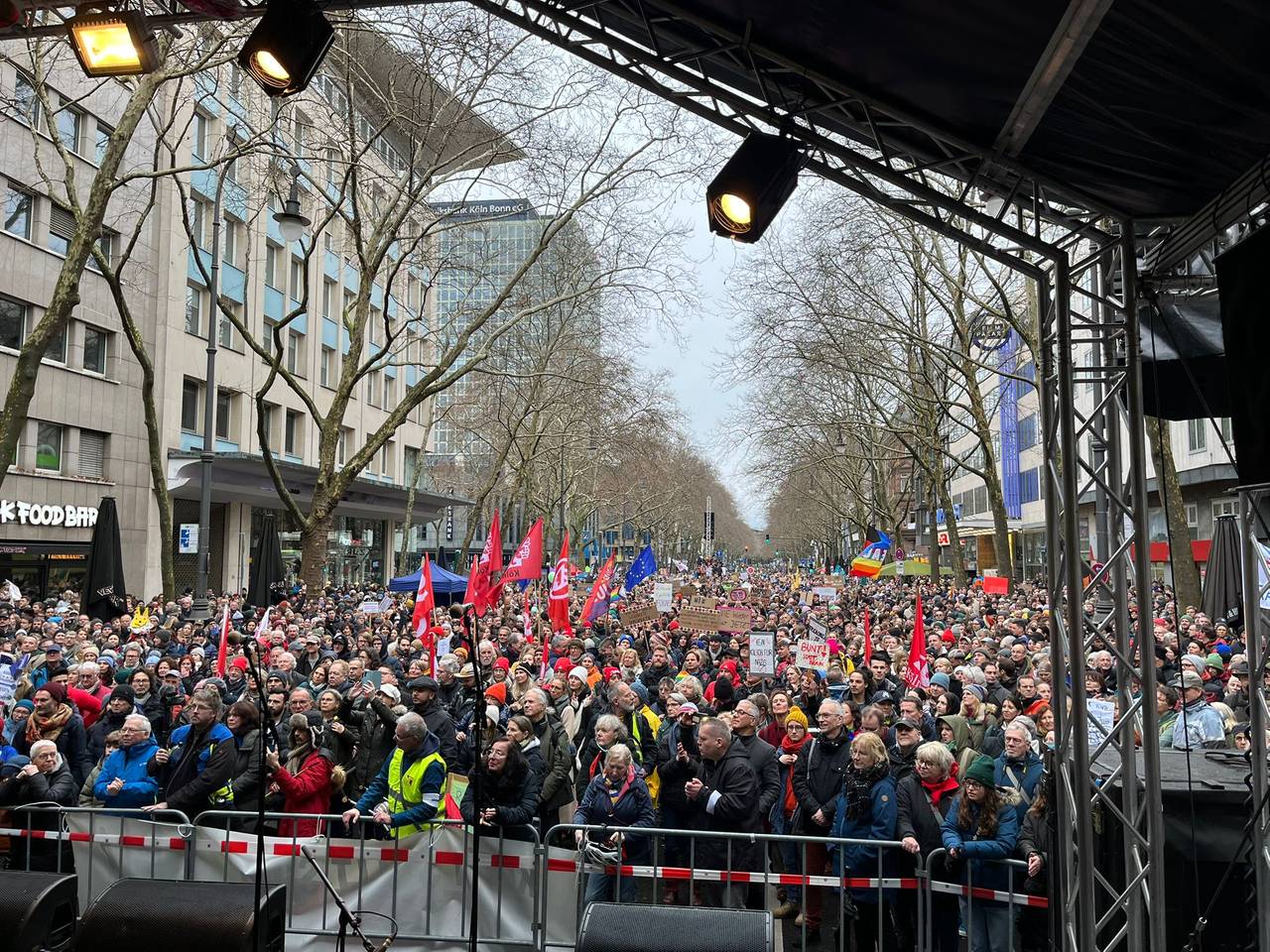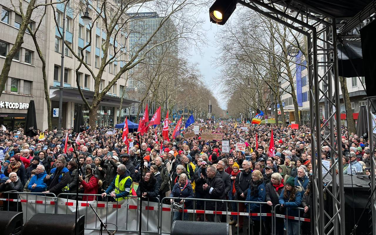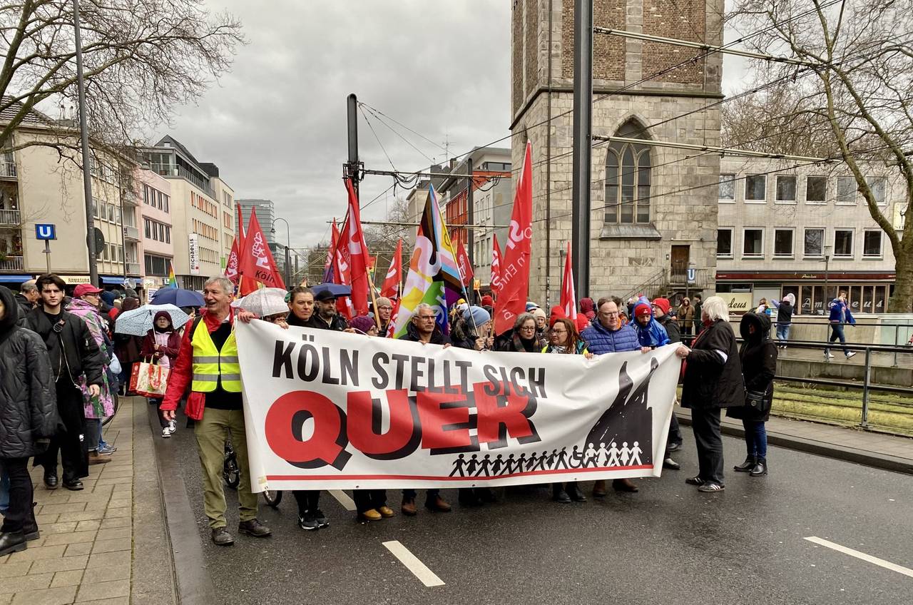 Ursprünglich angemeldet für die Großkundgebung waren 5.000 Teilnehmerinnen und Teilnehmer. Gekommen sind soooo viele mehr. Die Polizei spricht in ihrer ersten Bilanz von mehr als 40.000 Menschen – die Veranstalter sogar von bis 75.000. (Stand 15:30 Uhr). Die Innenstadt platzte fast aus allen Nähten. Während die Spitze des Demo-Zuges mit Bündnis-Vertretern von "Köln stellt sich quer", von Gewerkschaften, den Kirchen und vielen verschiedenen anderen Initiativen schon am Rudolfplatz bzw. dem Hohenzollernring angekommen war, standen noch tausende auf dem Heumarkt, der Cäcilienstraße und rund um den Neumarkt und in den Nebenstraßen. Dabei wurde überall auch getanzt, geklatscht, gepfiffen, getrommelt und gemeinsam Krach gemacht. Auf der Bühne hat u.a. Kölns Oberbürgermeisterin Henriette Reker gesprochen. Auch Vereine und Initiativen wie Cologne Pride und Studis gegen Rechts, Fridays for future waren dabei. Außerdem traten unter anderem Brings und Rapper Eko Fresh auf. Eine Polizeisprecherin sagte in einer ersten Bilanz, es sei trotz der vielen tausend Menschen in der City in Sachen Demo weitgehend störungsfrei geblieben. (RO)