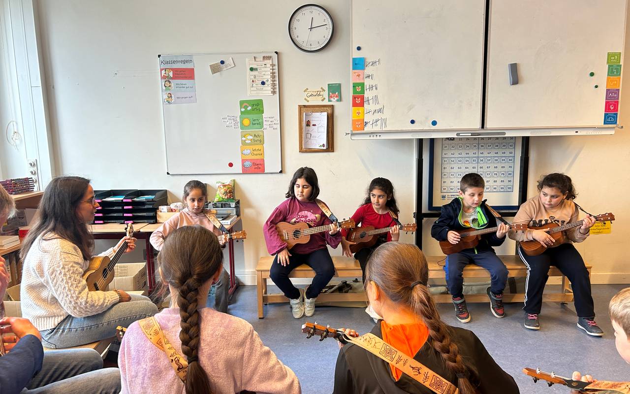 Dort wird den Schülerinnen und Schülern das Ukulele-Spielen beigebracht. Die Rheinische Musikschule will da die musikalische Früherziehung fördern, wo Kinder privat eher wenig Musikinstrumente spielen. Denn Musik machen stärke die kognitiven und sozialen Fähigkeiten der Kinder. Das Pilotprojekt soll von der Stadt ausgewertet und vielleicht sogar ausgeweitet werden.