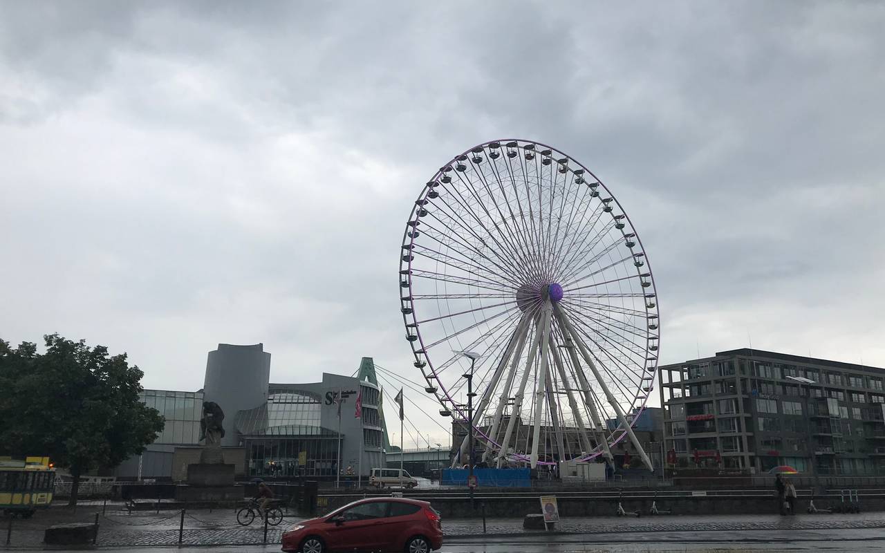 Noch bis mindestens Anfang August soll das Riesenrad bei uns in Köln stehen. Annette Imhof vom Schokoladenmuseum freut sich über die neue Attraktion.