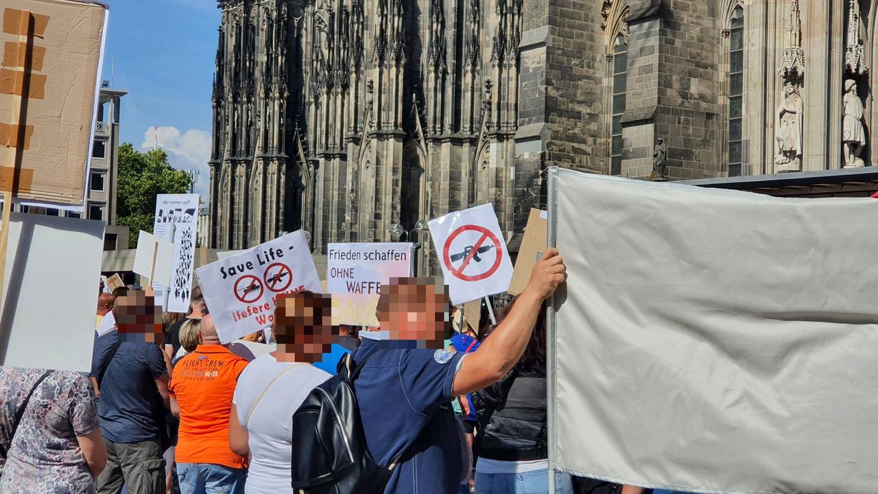 +++ 12:45 Am Roncalliplatz haben sich nach Einschätzungen von Radio Köln-Reporter Frank Waltel rund 400 bis 500 Teilnehmende eingefunden. Auf den Demonstrationsschildern sind unter anderem die üblichen Corona-Kritiken zu lesen, aber auch Aufforderungen zu Protest und Widerstand. Markus Beisicht, einer der wohl umstrittensten Redner der heutigen pro Russland Demo, habe der Bundesregierung einen "heißen Herbst" angekündigt. Darüber hinaus werden unter großem Applaus Grüße an Staatsoberhaupt Putin ausgerichtet und ihm versichert, dass es auch in Deutschland viele Anhänger gebe.