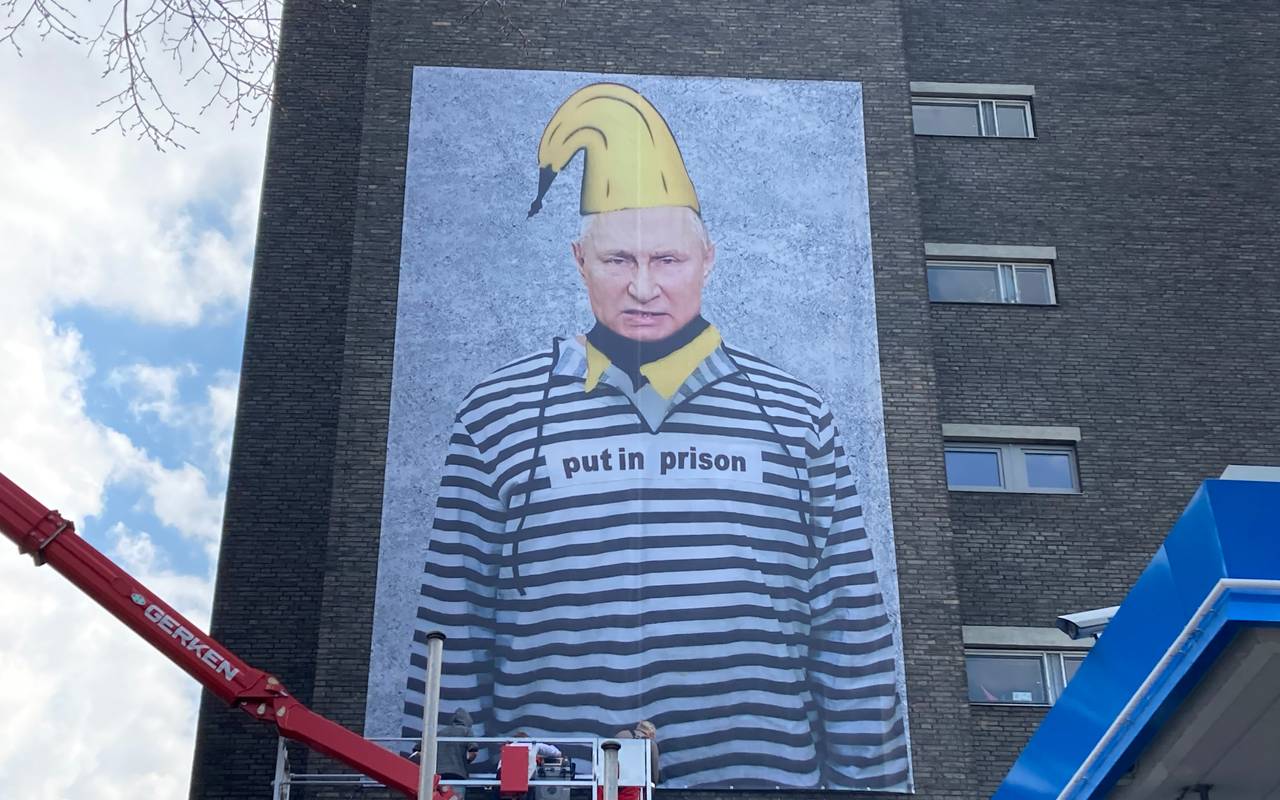 (PH) Der grimmig schauende russische Staatschef Wladimir Putin in Sträflingskleidung, einer schlaff vom Kopf hängenden Banane und der Brust Aufschrift "Put-in-Prison" ist das neue Kunstwerk des Kölner Bananensprayers Thomas Baumgärtel.