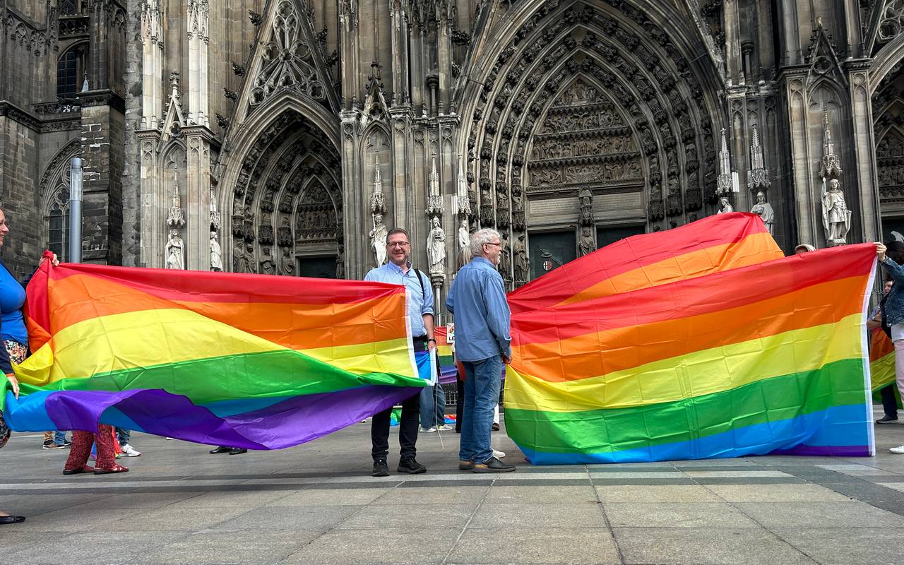 Protest vor Kölner Dom gegen Regenbogenverbot