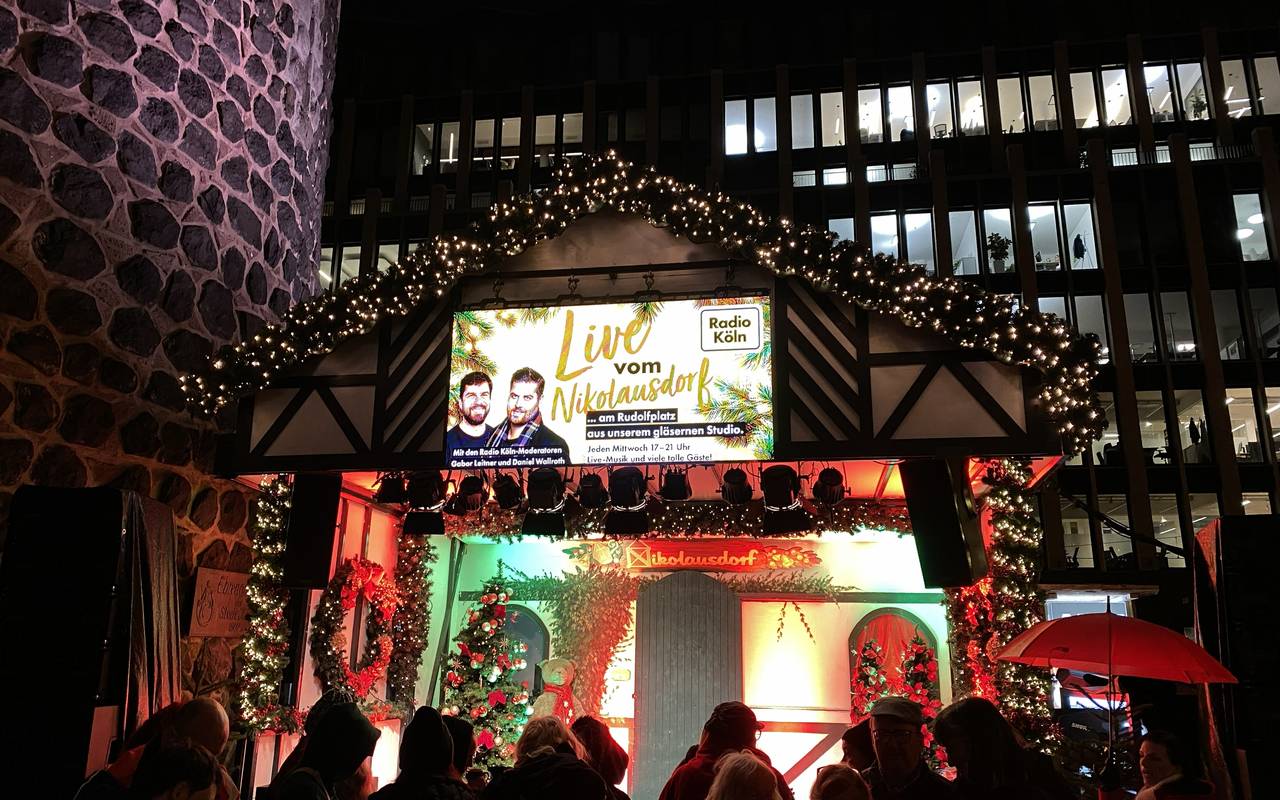 Glühwein, gebrannte Mandeln und dazu Radio Köln! Heute ist es so weit: Wir senden zum ersten Mal live vom Nikolausdorf, dem Weihnachtsmarkt auf dem Rudolfplatz.