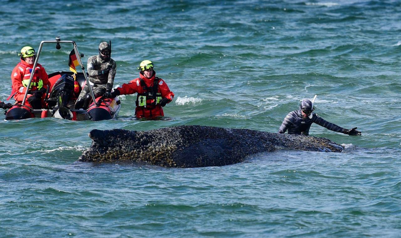 Zwischenzeitlich stand der Biologe Robert Marc Lehmann während der Rettungsaktion neben dem Wal im Wasser und leitete den Schwimmbagger an. Er begutachtete das Tier auch vor dem am frühen Morgen gestarteten Rettungsversuch. Der Wal reagierte auf die Annäherung mit lautem Schnauben und heftigen Bewegungen.
