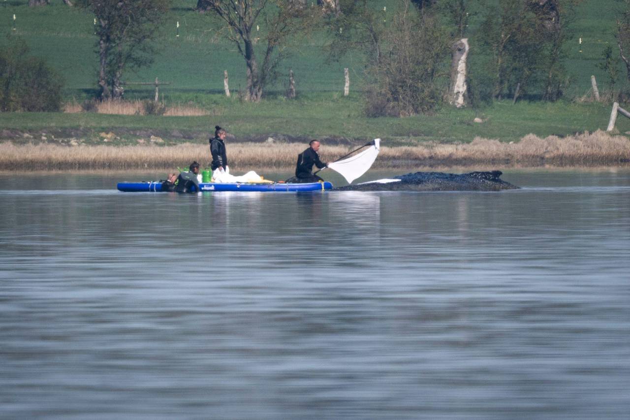 Am Morgen hatte der Buckelwal mit heftigen Bewegungen auf einen sich nähernden Taucher reagiert. Das Tier schlug heftig mit der Schwanzflosse, der Fluke, und drehte sich um beinahe 90 Grad, wie in Livestreams zu sehen war. Nach wenigen Minuten beruhigte sich der Wal wieder und lag erneut still im Wasser. Später fuhren die Helfer erneut mit einem Boot zum Wal und erneuerten die nassen Tücher auf dem Rücken des Wals, wie auf Livestreams von Medien zu sehen war.