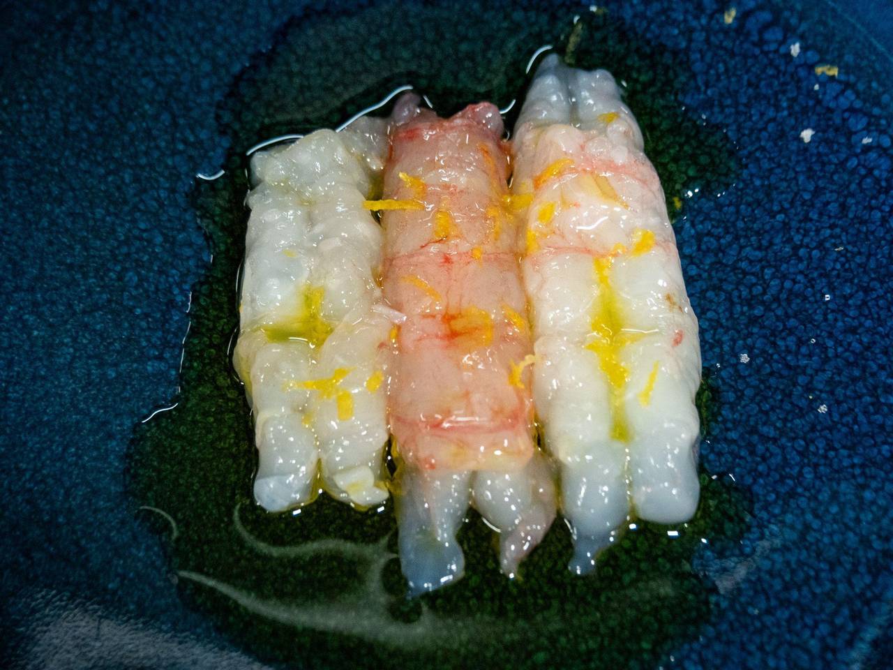Simpel, aber effektvoll: Scampi-Filets werden in dünne Scheiben geschnitten und mit einem Spritzer Zitrone, etwas Meersalz, Zitronenabrieb und Olivenöl abgerundet.