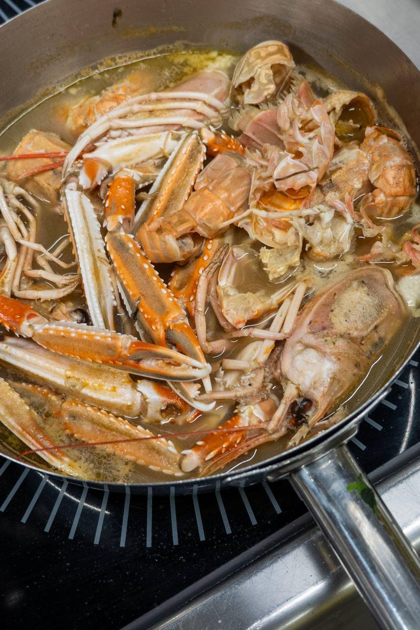 Die übrigen Scampi-Teile landen nicht in der Biotonne, sondern im Topf: alles mit Wasser bedecken und eine halbe Stunde auskochen. Das ergibt den idealen Fond für ein Scampi-Risotto oder Scampi mit Pasta.