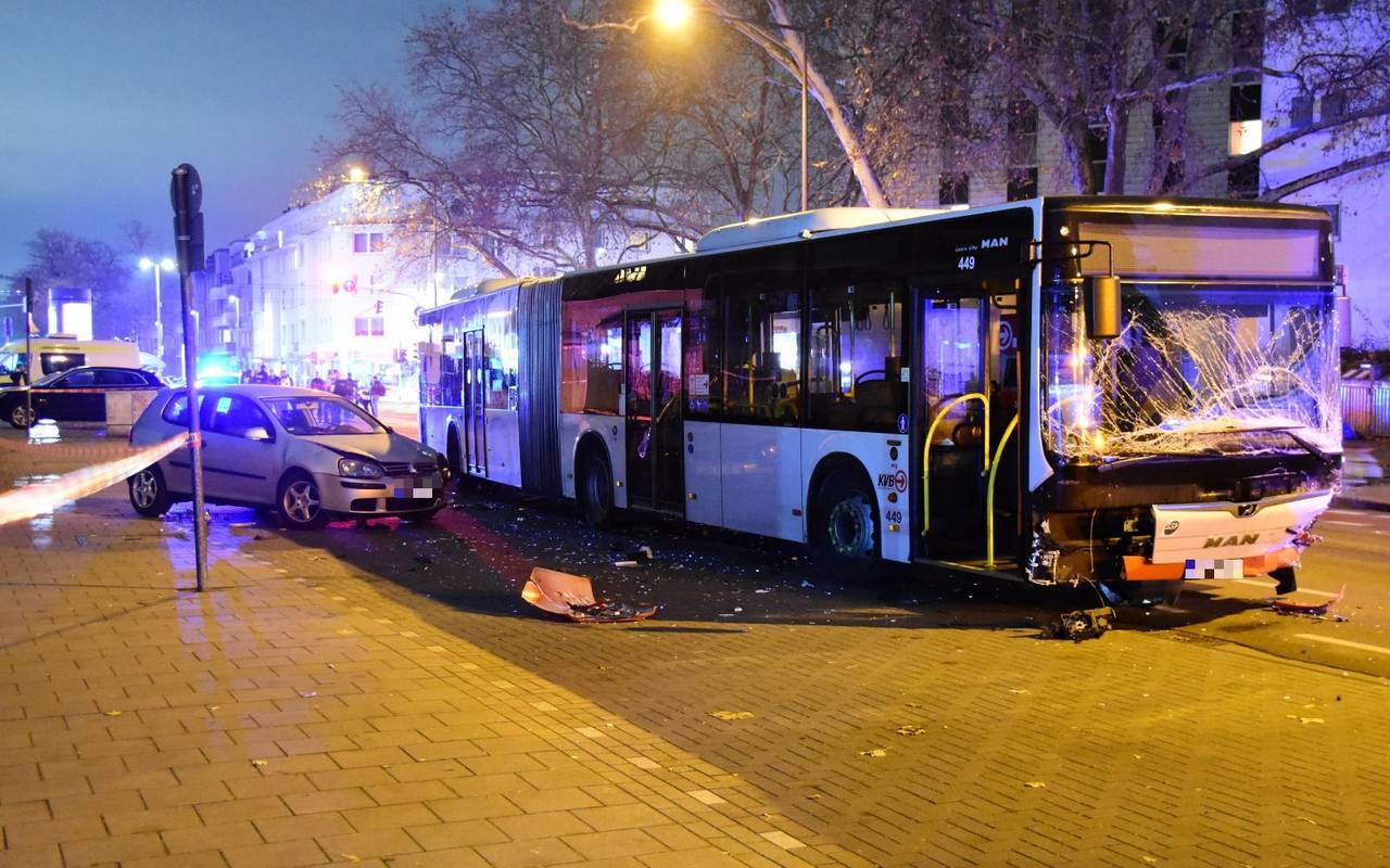 Insgesamt wurden 7 Personen bei dem Unfall verletzt, einige von ihnen schwer. Außerdem wurden laut Feuerwehr mehrere Personen in den Fahrzeugen eingeklemmt und mussten befreit werden. Nach ersten Ermittlungen soll der stark alkoholisierte 47-jährige Fahrer (2,4 Promille) mit seinen fünf Mitfahrern gegen 22 Uhr auf der Waldecker Straße mit deutlich überhöhter Geschwindigkeit in den Gegenverkehr gefahren und dort mit dem in Richtung Kalk fahrenden Bus zusammen gestoßen sein. Der Bus kollidierte anschließend mit einem geparkten Golf. Die Polizei stellte den BMW sicher. Die KVB ließ den Bus abschleppen. Im Krankenhaus wurde dem 47-Jährigen auf Anordnung der Polizei eine Blutprobe entnommen. Das Verkehrsunfallaufnahmeteam unterstütze die Einsatzkräfte bei der Unfallaufnahme.