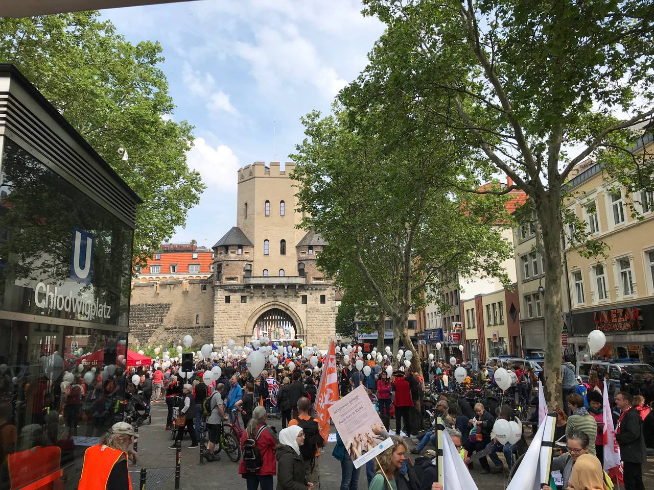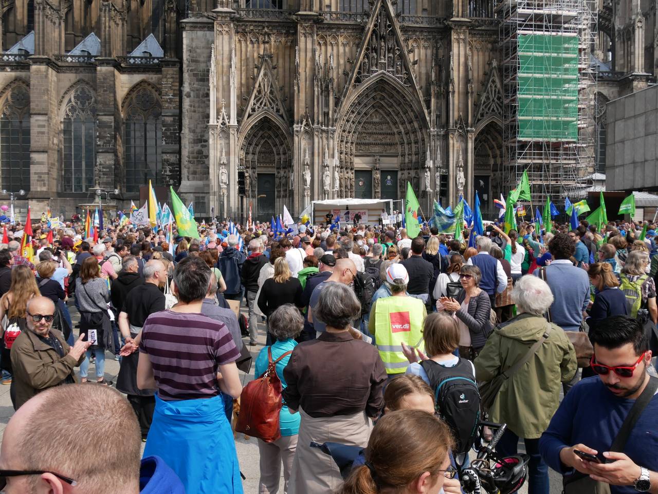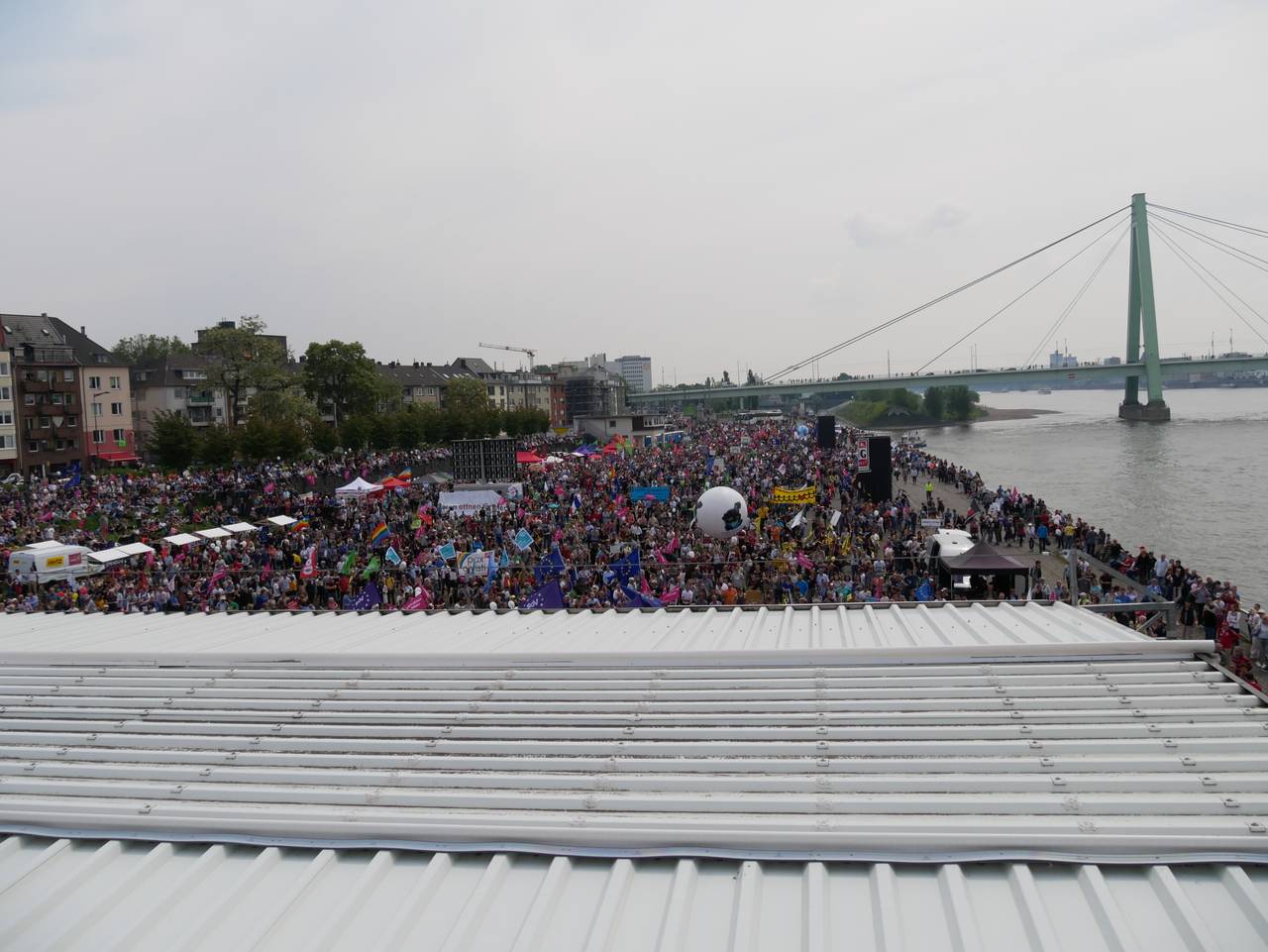 12.40 Uhr: Die ersten Demonstrationszüge sind inzwischen an der Deutzer Werft angekommen, andere sind noch in der Innenstadt unterwegs. Auf der Bühne hat das Vorprogramm begonnen; um 13 Uhr startet das Hauptprogramm.