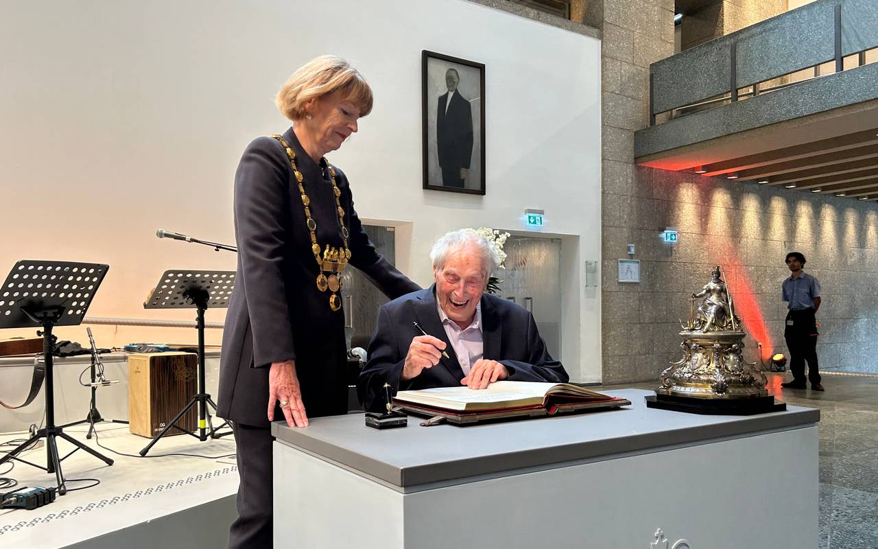 100 Jahre alt und zum zweiten Mal geehrt: Ludwig Sebus, die bekannte Stimme des Kölner Karnevals, durfte sich zum zweiten Mal ins Goldene Buch der Stadt Köln eintragen.