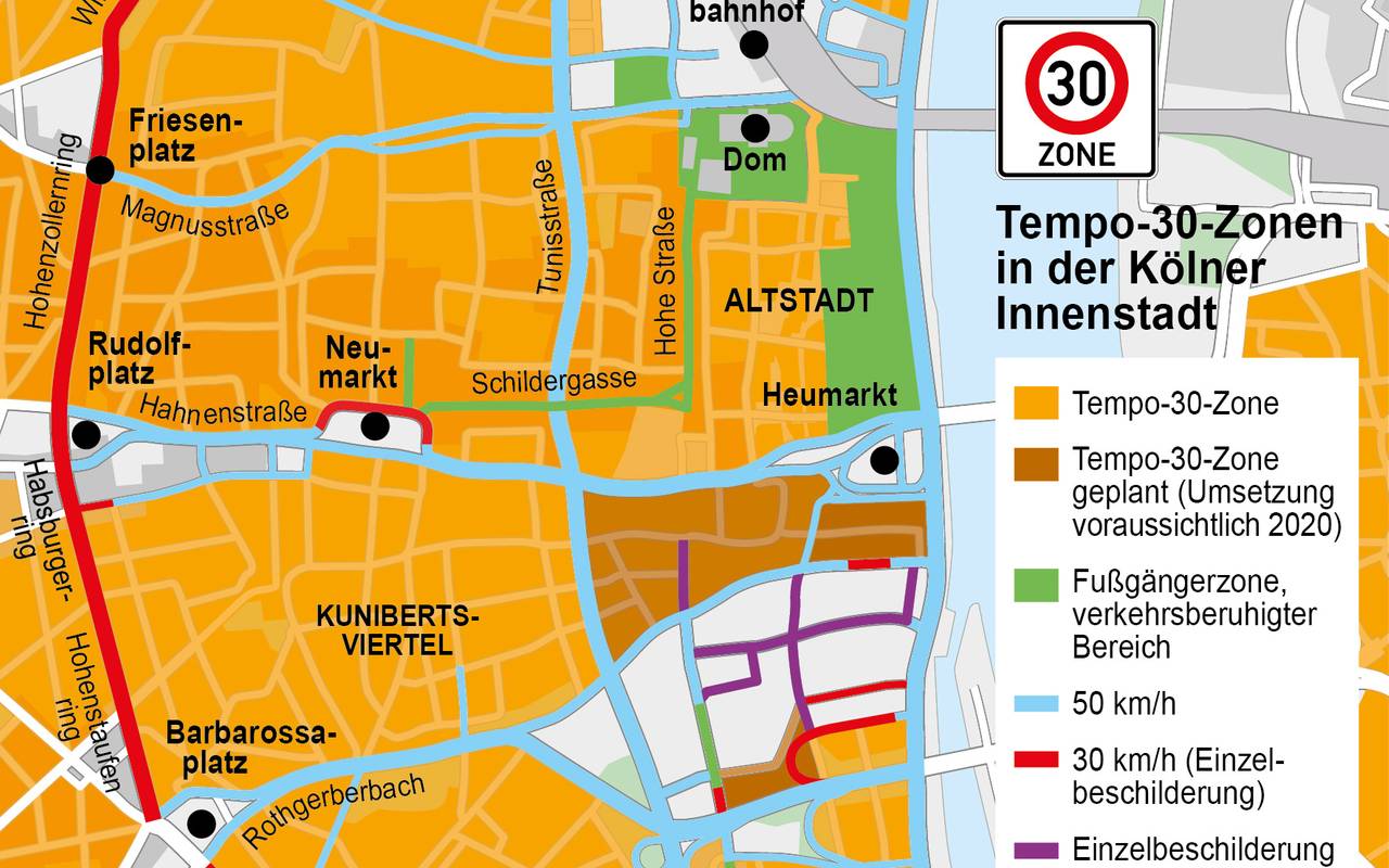 Vor zehn Jahren sei Tempo 30 auf den Ringen etwa undenkbar gewesen, heute zeige sich, dass es funktioniere. In der Innenstadt und den Wohngebieten sei Köln fast flächendeckend auf Tempo 30 Zonen umgestiegen. Für das Georgsviertel liefen die Planungen, Pfälzerstraße und Moselstraße in der Südstadt würden in einem Jahr an das System angeschlossen, so Reker. Auf den Hauptverkehrsstraßen gelte aber weiter Tempo 50.