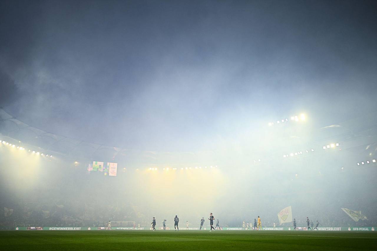 Nachdem die Fanlager die Teams eingestimmt hatten, verzögerte Rauch von der rot leuchtenden Pyrotechnik auf VfB-Seite den Anpfiff um wenige Minuten. Auf dem Rasen begann die Partie hitzig. Nach einer guten Viertelstunde hatten sich vier Spieler - je zwei auf jeder Seite - Gelbe Karten abgeholt.