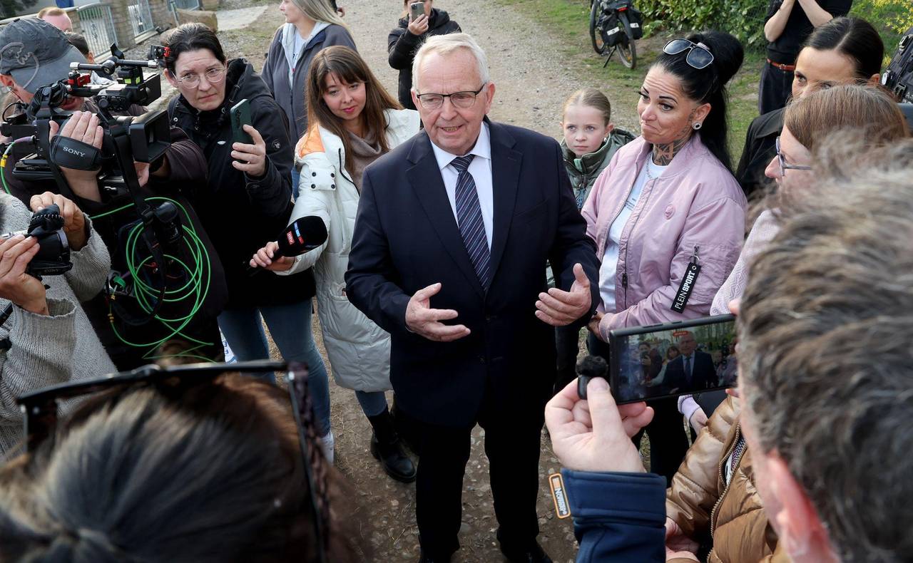 Till Backhaus (SPD), Umweltminister des Landes Mecklenburg-Vorpommern, spricht am Mittwochabend vor Ort auf der Ostseeinsel Poel zu Demonstranten, Aktivisten und Journalisten.© Bernd Wüstneck/dpa