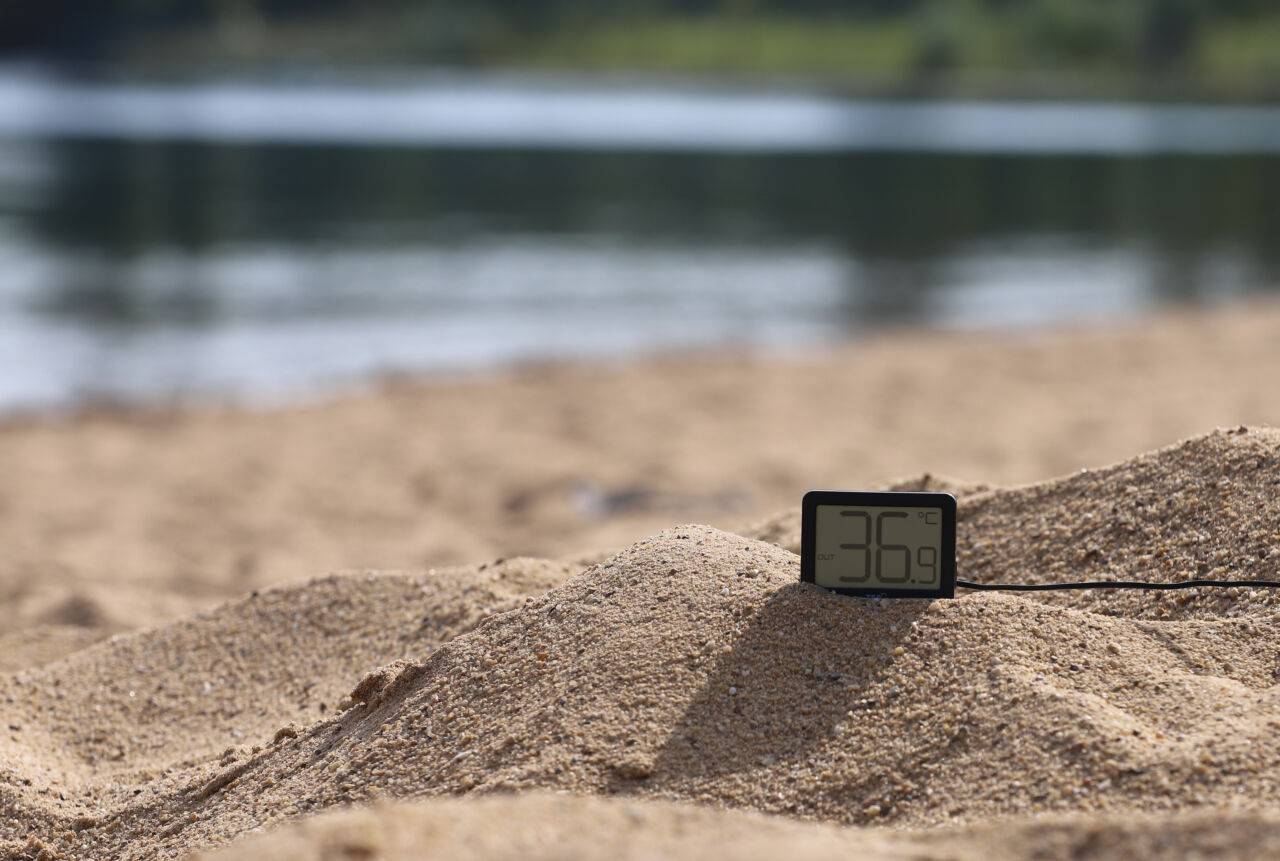 Ein Thermometer zeigt an einem Badestrand knapp 37 Grad an.