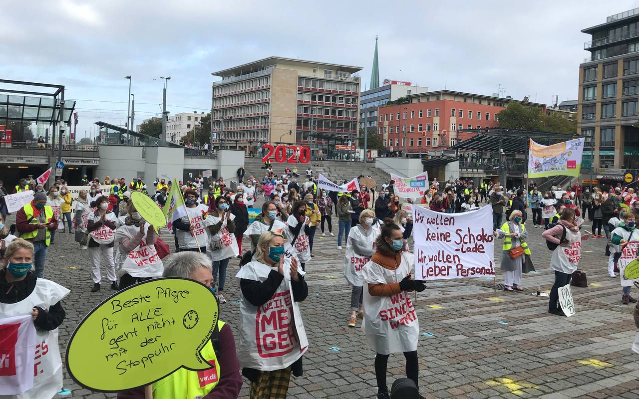 ver.di fordert für die Beschäftigten im Gesundheitswesen unter anderem eine 300 Euro Pflegezulage, eine bessere Bezahlung und eine Begrenzung der Arbeitszeit auf 45 Wochenstunden.