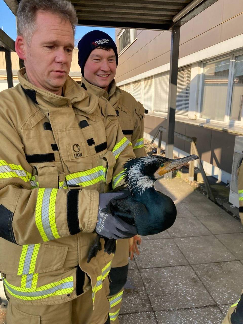 Der Kormoran stand am Sonntag vor der Notaufnahme.© -/Feuerwehr Bremen/dpa