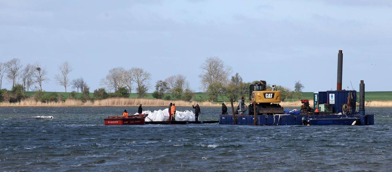 Am Hafen von Kirchdorf wurde ein kleiner Kettenbagger auf einen Schwimmponton gebracht, mit dem die Big Bags später ins Wasser gesetzt werden sollten. Fast fertig war am Morgen nach Angaben aus dem Team eine rund 110 Meter lange Rinne, die von der Mulde des Wals in tieferes Wasser führt. Durch diese rund zwei Meter tiefe Rinne soll der Wal nach Idee der privaten Initiative in tieferes Wasser schwimmen oder gegebenenfalls gezogen werden.