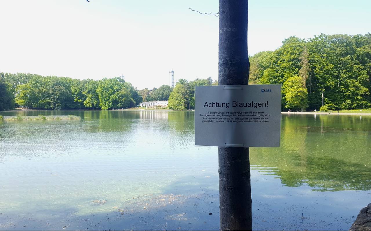 Blaualgen können hautreizend und giftig wirken. Zwar sei das Baden in öffentlichen Gewässern gemäß der Stadtordnung sowieso verboten. Aber auch Hunde sollten derzeit nicht aus dem Weiher trinken. Die StEB hat nach eigenen Angaben Hinweisschilder am Weiher aufgestellt. Blaualgen kämen in geringer Menge in nahezu jedem Gewässer vor und seien weitgehend ungefährlich. Wenn sie sich aber etwa bei starker Sonneneinstrahlung stark vermehren, bilden sie Gifte und können die Gesundheit von Menschen und Tieren gefährden.