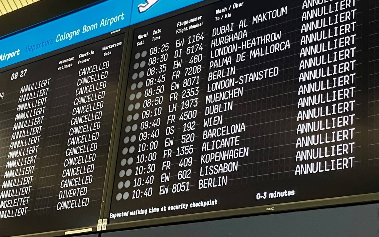 Die Warnstreiks am Flughafen Köln/Bonn führen zu massiven Flugausfällen. 98 Flüge wurden bereits annulliert. Weitere Störungen sind zu erwarten.